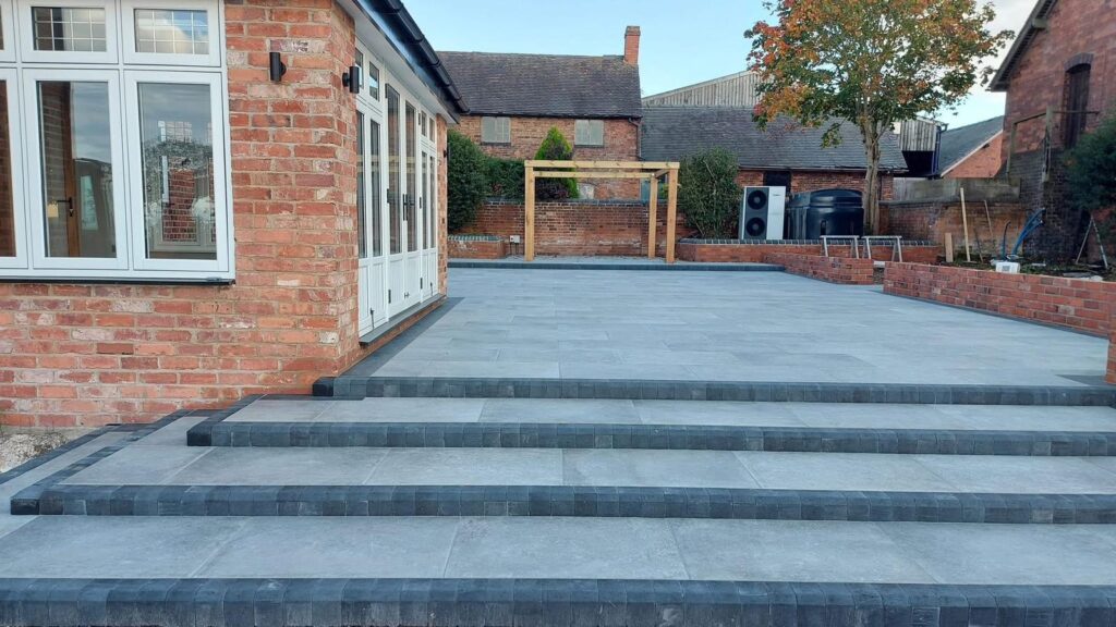 Modern porcelain patios that create a sleek, low maintenance outdoor space perfect for relaxing, dining and entertaining.